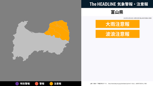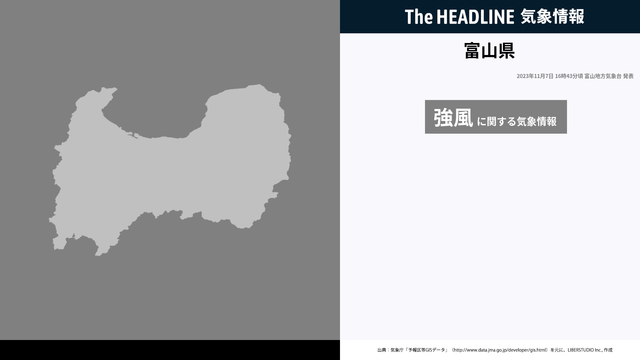 11月7日16時43分、富山地方気象台は、富山県に発表されている警報・注意報の経過、予測、防災上の留意点などを解説するために発表していた気象情報を更新した。