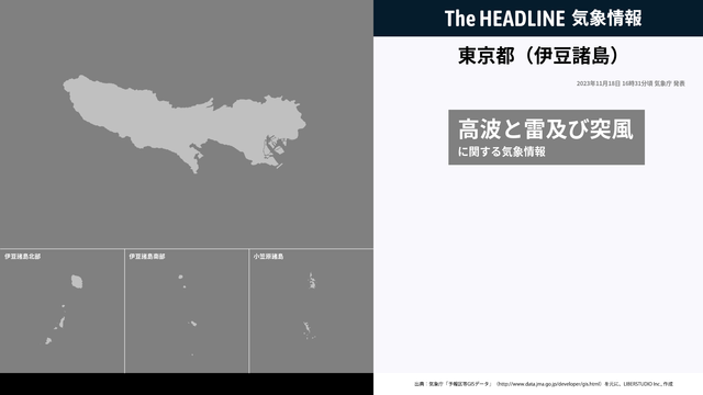 11月18日16時31分、気象庁は、東京都(伊豆諸島)に発表されている警報・注意報の経過、予測、防災上の留意点などを解説するために発表していた気象情報を更新した。