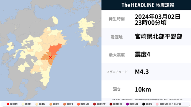 3月2日23時0分頃、宮崎県で最大震度4の地震を観測