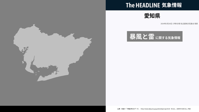 3月20日17時5分、名古屋地方気象台は、愛知県に発表されている警報・注意報の経過、予測、防災上の留意点などを解説するために発表していた気象情報を更新した。