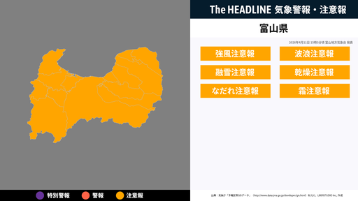 4月25日10時45分、富山地方気象台は、警報・注意報に先立ち注意・警戒を呼びかけるため富山県に黄砂に関する気象情報を発表した。