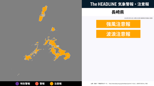 4月29日16時5分、長崎地方気象台は、長崎県に発表されている警報・注意報の経過、予測、防災上の留意点などを解説するために発表していた気象情報を更新した。