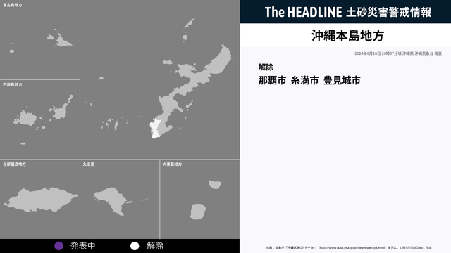 6月18日20時57分、沖縄本島地方の土砂災害警戒情報が解除された