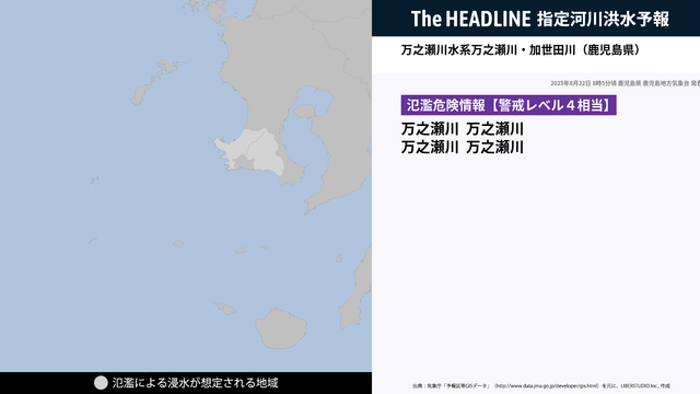 8月22日8時05分、鹿児島県と鹿児島地方気象台は、万之瀬川水系万之瀬川・加世田川で氾濫危険水位付近の水位が続く見込みであると発表した。