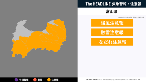 6月24日5時25分、富山地方気象台は、富山県に発表されている警報・注意報の経過、予測、防災上の留意点などを解説するために発表していた気象情報を更新した。