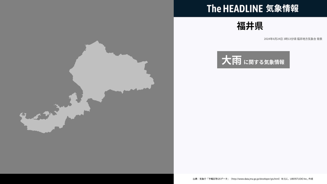 6月24日3時13分、福井地方気象台は、福井県に発表されている警報・注意報の経過、予測、防災上の留意点などを解説するために発表していた気象情報を更新した。