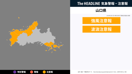 6月23日14時40分、下関地方気象台は、山口県に発表されている警報・注意報の経過、予測、防災上の留意点などを解説するために発表していた気象情報を更新した。