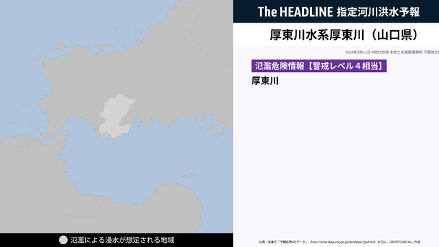 【警戒レベル4相当】これは、避難指示の発令の目安です。厚東川の持世寺水位観測所(宇部市)では、「氾濫危険水位」に到達しました。厚東川では堤防決壊等による氾濫のおそれがあり、宇部市では浸水するおそれがあります。直ちに、市町村からの避難情報を確認するとともに、各自安全確保を図るなど、適切な防災行動をとってください。