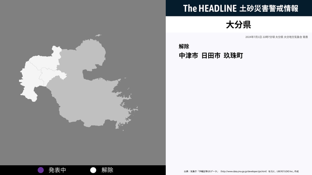 7月1日22時7分、大分県の土砂災害警戒情報が解除された