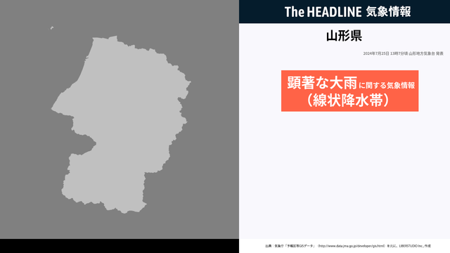 7月25日13時7分、山形地方気象台は、線状降水帯による非常に激しい雨の影響で命に危険が及ぶ災害発生の危険度が急激に高まっていることを発表した。庄内・最上では、土砂災害や洪水に厳重に警戒する必要がある。