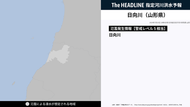 7月25日18時00分、庄内総合支庁河川砂防課と山形地方気象台は、日向川で氾濫が発生したと発表した。