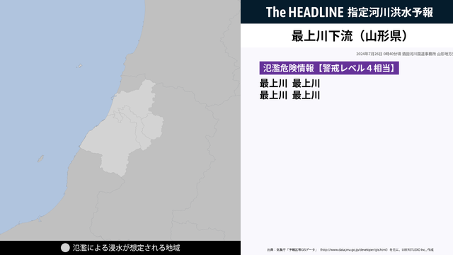 7月26日0時40分、酒田河川国道事務所と山形地方気象台は、最上川下流で氾濫危険水位付近の水位が続く見込みであると発表した。