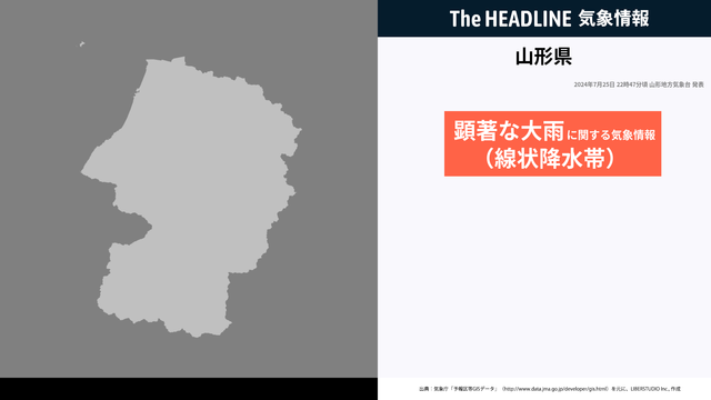 7月25日22時47分、山形地方気象台は、線状降水帯による非常に激しい雨の影響で命に危険が及ぶ災害発生の危険度が急激に高まっていることを発表した。村山・庄内、最上では、土砂災害や洪水に厳重に警戒する必要がある。