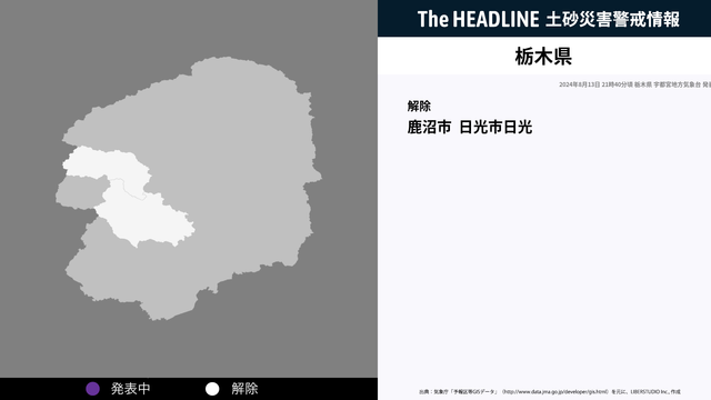 8月13日21時40分、栃木県の土砂災害警戒情報が解除された