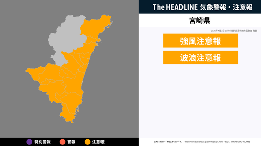 8月20日5時15分、宮崎地方気象台は、宮崎県に発表されている警報・注意報の経過、予測、防災上の留意点などを解説するために発表していた気象情報を更新した。