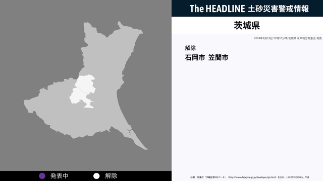 8月19日22時20分、茨城県の土砂災害警戒情報が解除された