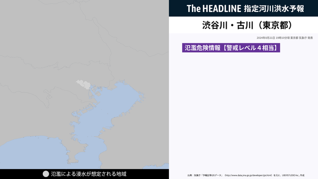 8月21日19時10分、東京都と気象庁は、渋谷川・古川で氾濫危険水位に到達し、氾濫の恐れがあると発表した。