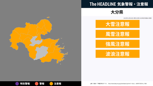 8月22日16時15分、大分地方気象台は、大分県に発表されている警報・注意報の経過、予測、防災上の留意点などを解説するために発表していた気象情報を更新した。