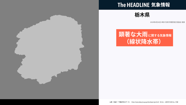 8月26日0時27分、宇都宮地方気象台は、線状降水帯による非常に激しい雨の影響で命に危険が及ぶ災害発生の危険度が急激に高まっていることを発表した。栃木県北部では、土砂災害や洪水に厳重に警戒する必要がある。