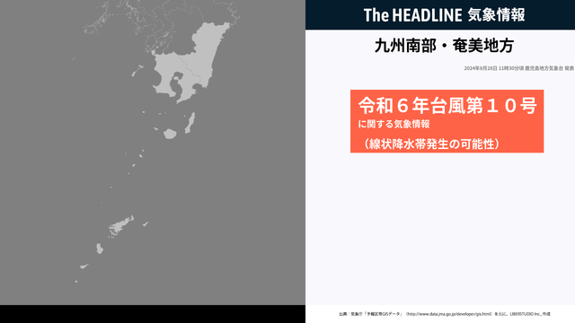 8月28日11時30分、鹿児島地方気象台は、線状降水帯が発生して大雨災害の危険度が急激に高まる可能性を発表した。九州南部では、暴風やうねりを伴った高波、高潮に最大級の警戒をし、土砂災害、低い土地の浸水、河川の増水や氾濫に厳重に警戒する必要がある。