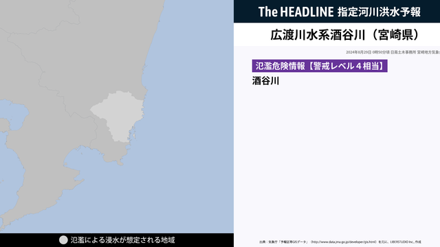 8月29日0時50分、日南土木事務所と宮崎地方気象台は、広渡川水系酒谷川で氾濫危険水位に到達し、氾濫の恐れがあると発表した。