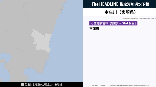 【警戒レベル4相当】これは、避難指示の発令の目安です。本庄川の嵐田水位観測所(東諸県郡国富町)では、「氾濫危険水位」に到達しました。本庄川では堤防決壊等による氾濫のおそれがあり、東諸県郡国富町、東諸県郡綾町、宮崎市では浸水するおそれがあります。直ちに、市町村からの避難情報を確認するとともに、各自安全確保を図るなど、適切な防災行動をとってください。