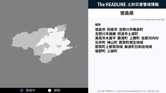 8月31日6時40分、土砂災害の危険性の高まりから徳島県 徳島地方気象台より徳島県に発表されていた、土砂災害警戒情報が解除された。