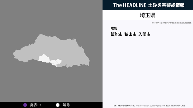 9月1日15時10分、埼玉県の土砂災害警戒情報が解除された