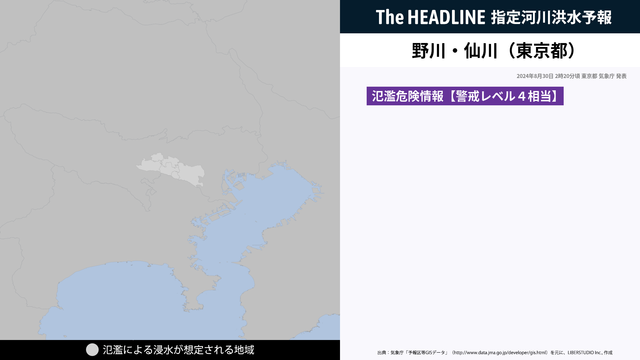 8月30日2時20分、東京都と気象庁は、野川・仙川で氾濫危険水位に到達し、氾濫の恐れがあると発表した。