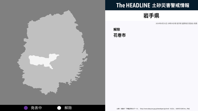 8月31日20時30分、岩手県の土砂災害警戒情報が解除された