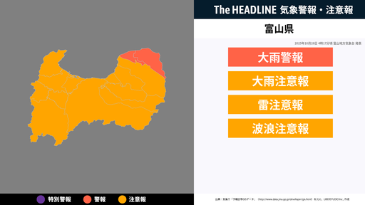 9月22日23時37分、富山地方気象台は、富山県に発表されている警報・注意報の経過、予測、防災上の留意点などを解説するために発表していた気象情報を更新した。