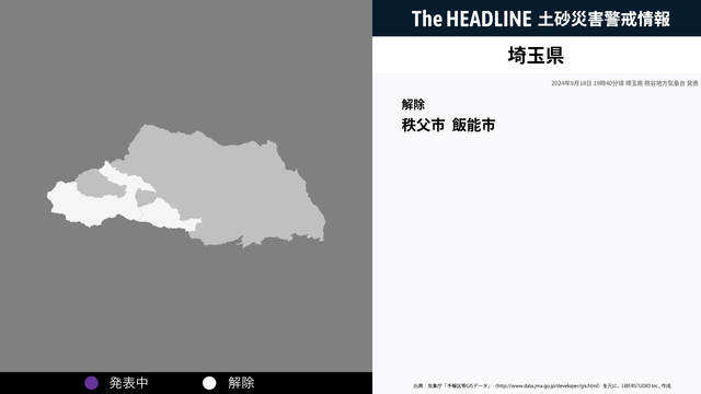 9月18日19時40分、埼玉県の土砂災害警戒情報が解除された