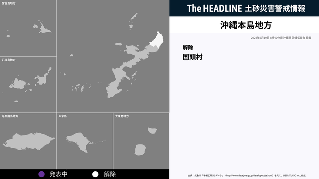 9月19日8時40分、沖縄本島地方の土砂災害警戒情報が解除された