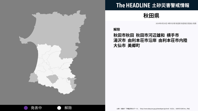 9月20日9時55分、秋田県の土砂災害警戒情報が解除された