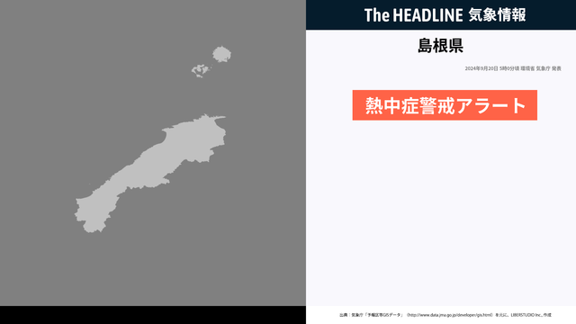 環境省と気象庁は、今日9月20日を対象とした熱中症警報アラートを島根県に対して発表しました。外出はなるべく避け、室内をエアコン等で涼しい環境にして過ごしてください。
