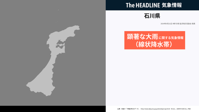 9月21日9時7分、金沢地方気象台は、線状降水帯による非常に激しい雨の影響で命に危険が及ぶ災害発生の危険度が急激に高まっていることを発表した。能登では、土砂災害や洪水に厳重に警戒する必要がある。