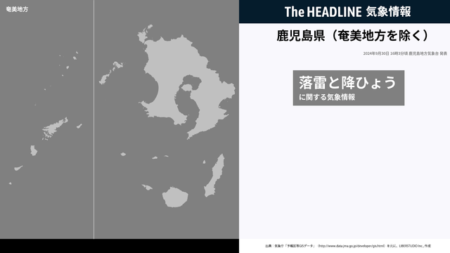 9月30日16時3分、鹿児島地方気象台は、警報・注意報に先立ち注意・警戒を呼びかけるため鹿児島県(奄美地方を除く)に発表していた気象情報を更新した。