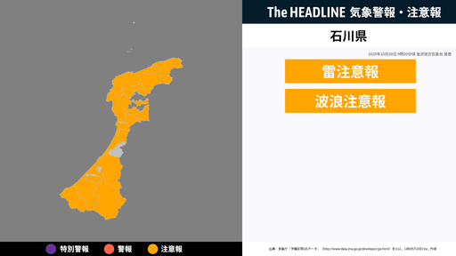 10月20日5時41分、金沢地方気象台は、石川県に発表されている警報・注意報の経過、予測、防災上の留意点などを解説するために発表していた気象情報を更新した。