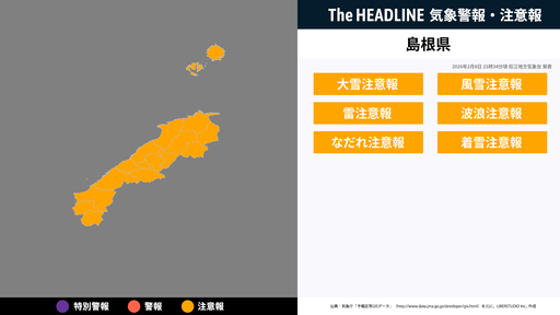 11月3日1時36分、松江地方気象台は、島根県に発表されている警報・注意報の経過、予測、防災上の留意点などを解説するために発表していた気象情報を更新した。