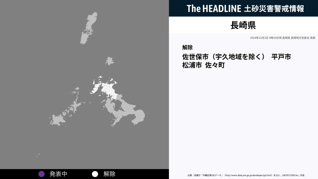 11月2日4時16分、長崎県の土砂災害警戒情報が解除された