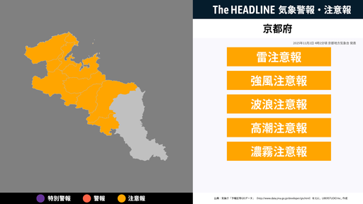 11月2日15時20分、土砂災害の危険性の高まりから京都府 京都地方気象台より京都府に発表されていた、土砂災害警戒情報が解除された。