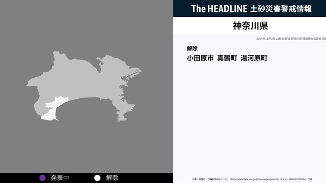 11月2日21時35分、神奈川県の土砂災害警戒情報が解除された