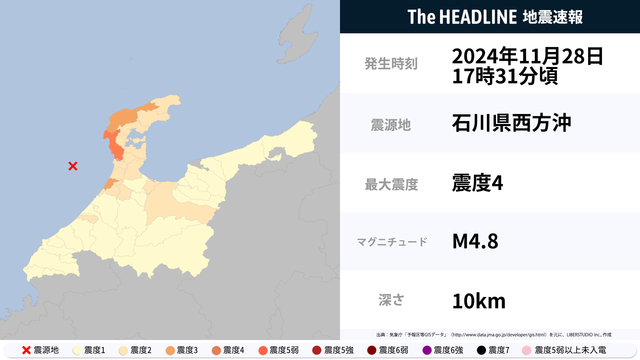 11月28日17時31分頃、石川県西方沖を震源とするマグニチュード4.8の地震が観測された。最大震度4を観測したのは、石川県。