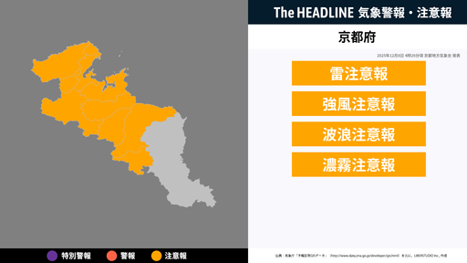12月19日5時30分、京都地方気象台は、京都府に発表されている警報・注意報の経過、予測、防災上の留意点などを解説するために発表していた気象情報を更新した。