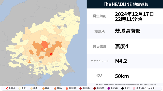 12月17日22時11分頃、茨城県南部を震源とするマグニチュード4.2の地震が観測された。最大震度4を観測したのは、栃木県。