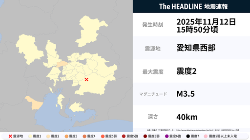 11月12日15時50分頃、岐阜県・三重県で最大震度2の地震を観測