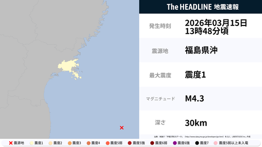 3月15日13時48分頃、宮城県で最大震度1の地震を観測