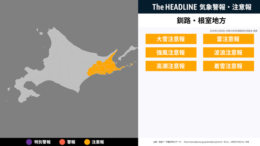 11月18日14時47分、釧路地方気象台より根室地方に波浪警報・強風注意報が発表された。対象の市区町村にお住まいの方は、最新の情報を入手しつつ、避難や警戒など適切な行動を取る必要がある。