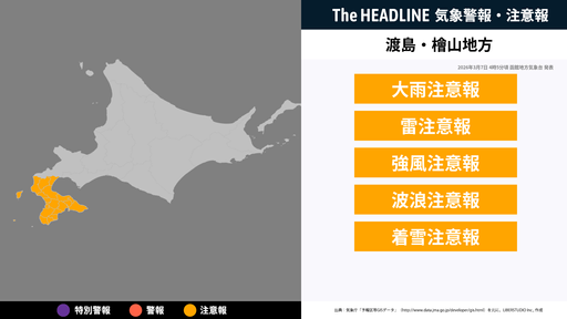 3月7日16時16分、函館地方気象台より渡島地方・檜山地方に暴風警報・大雨注意報などが発表された。対象の市区町村にお住まいの方は、最新の情報を入手しつつ、避難や警戒など適切な行動を取る必要がある。