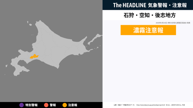 3月10日15時37分頃、石狩地方・空知地方・後志地方に濃霧注意報が発表